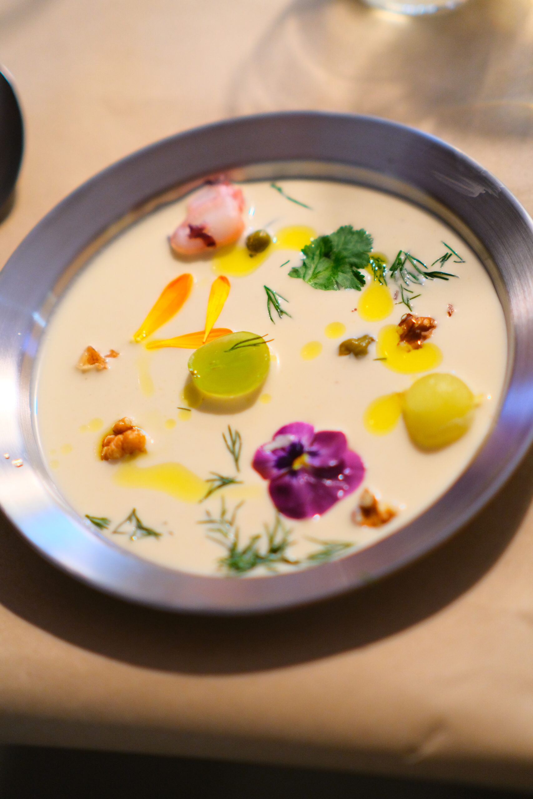 Ajo blanco. Comenzamos en Al-Ándalus, donde vivieron mis antepasados judíos paternos, donde los patios se llenaban de risas y debates, y donde el ajo blanco—un delicado gazpacho de almendras—ofrecía alivio fresco frente al calor del sur. Cuando llegó la Reconquista, se vieron obligados a partir, llevando consigo poco más que el recuerdo.