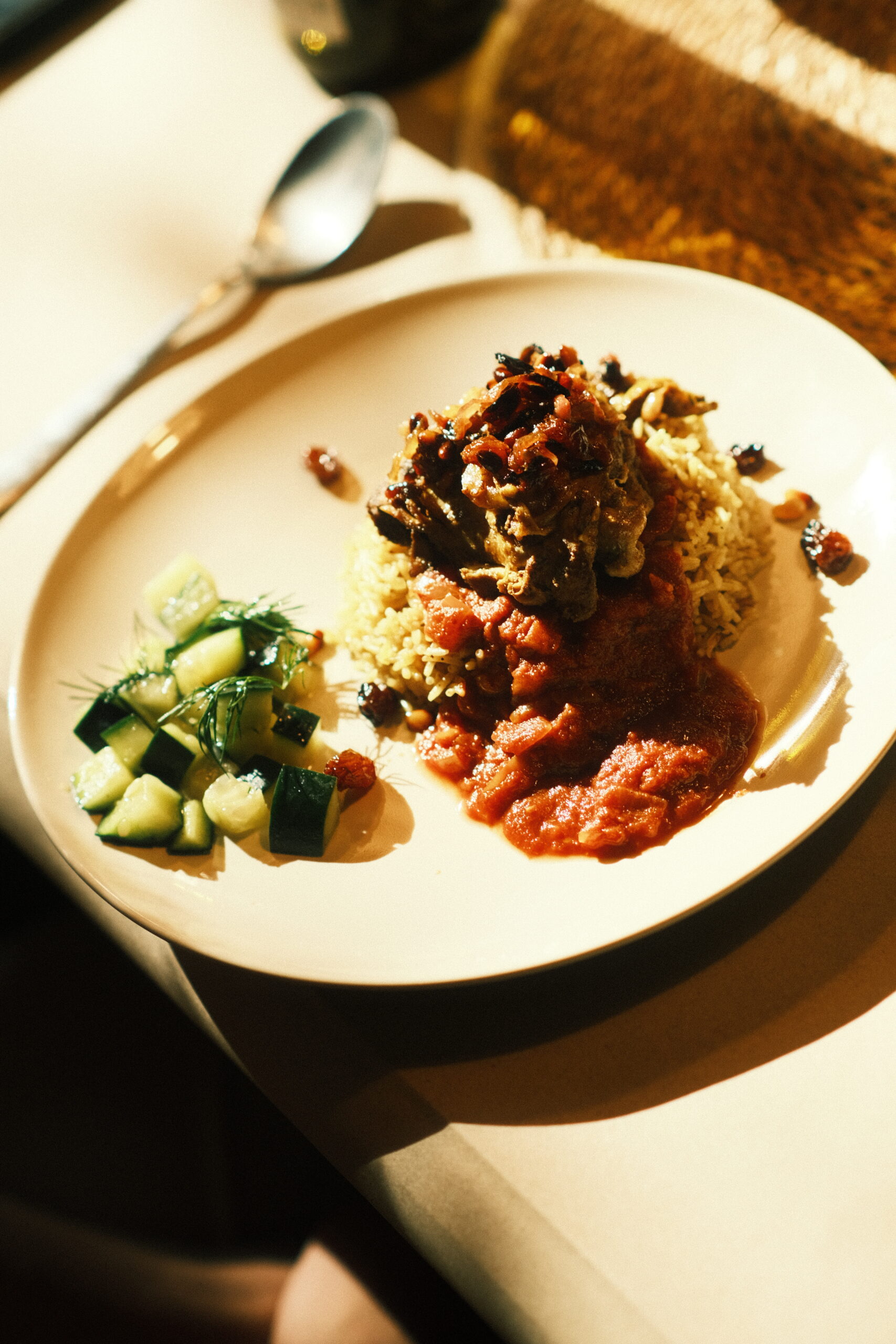 Mechboos. Por el lado materno, el viaje nos lleva a Kuwait, donde el mechboos, fragante con especias, es el corazón de cada reunión. Tradicionalmente se come con las manos, de un plato compartido; esta noche lo sirvo de manera diferente: porciones individuales, cubiertos al lado—una reflexión silenciosa de mi crianza europea, de las formas en que he tenido un pie en dos mundos, sin pertenecer del todo a ninguno.