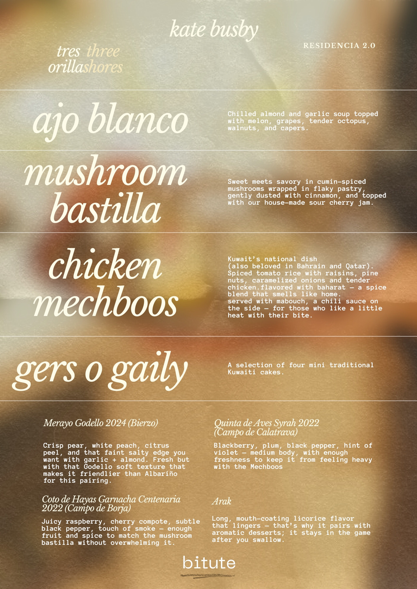 Residencia 2.0 Tres Orillas: La herencia de Kate es tan entrelazada y singular como su menú: su familia paterna son judíos marroquíes de Andalucía, mientras que su familia materna son musulmanes iraníes que emigraron a Kuwait. Adoptada y criada en el Reino Unido, Kate ha vivido en España durante 13 años. Este menú de residencia, moldeado por tres costas, es su manera de rastrear y acercarse a sus raíces a través de la comida y la narración.